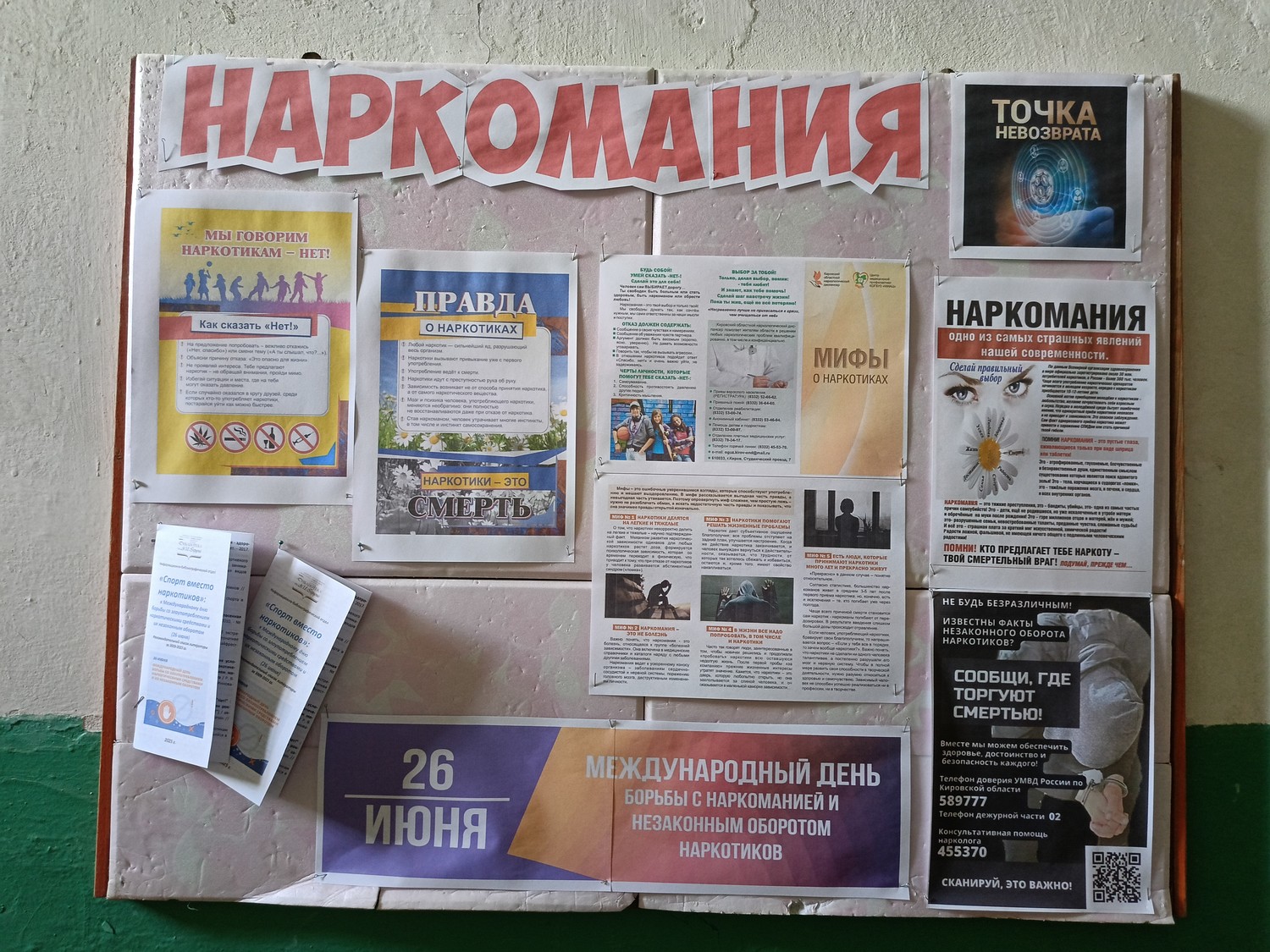 В фойе библиотеки размещен информационный стенд "Наркомания. Точка невозврата". На стенде представлена информация "Правда и мифы о наркомании", телефоны доверия, буклеты «Спорт вместо наркотиков».