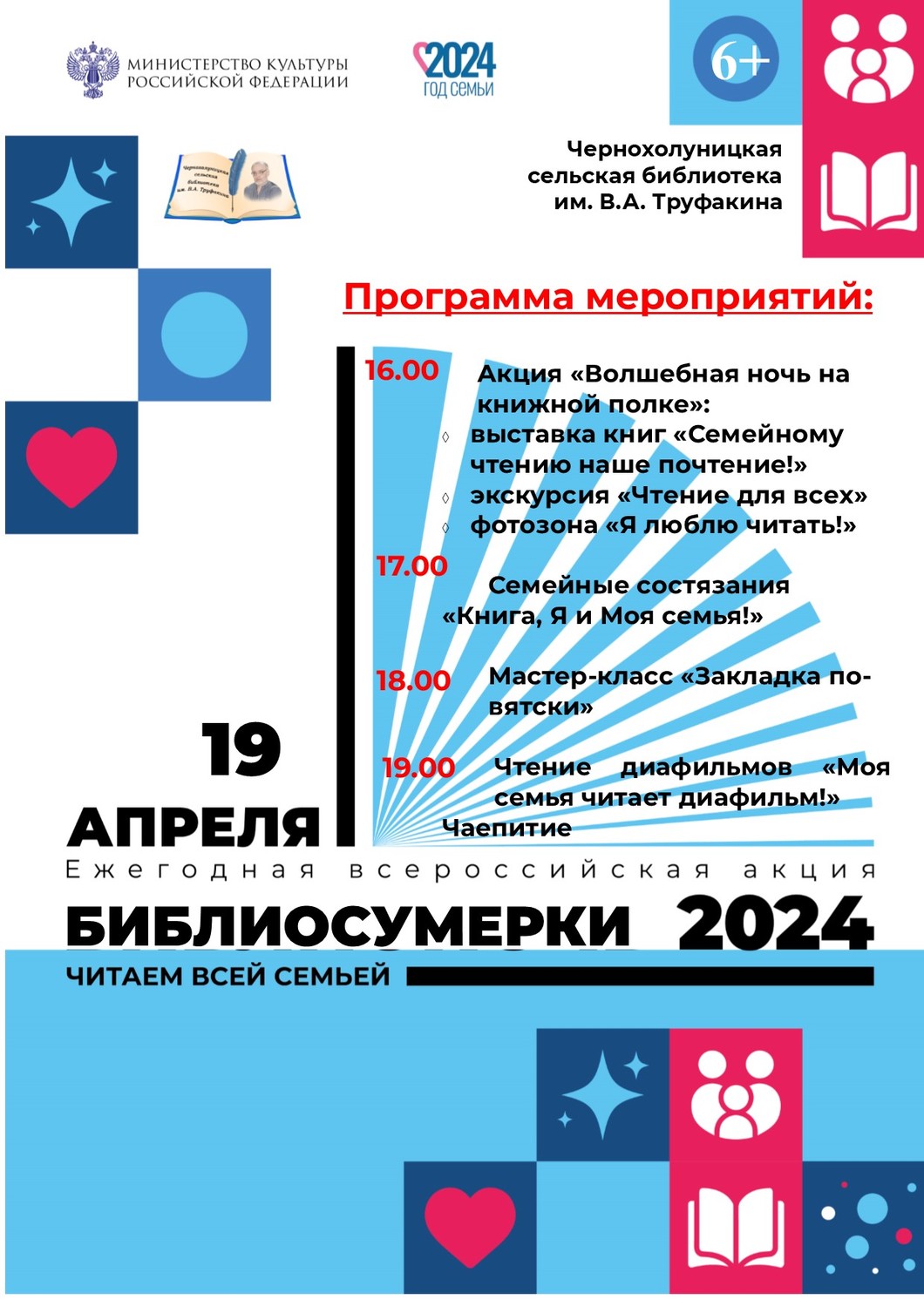 Дорогие друзья, в рамках ежегодной Всероссийской акции в поддержку чтения Библионочь – 2024 «Читаем всей семьей», наша библиотека подготовила интересную, познавательную программу. Приходите всей семьей!