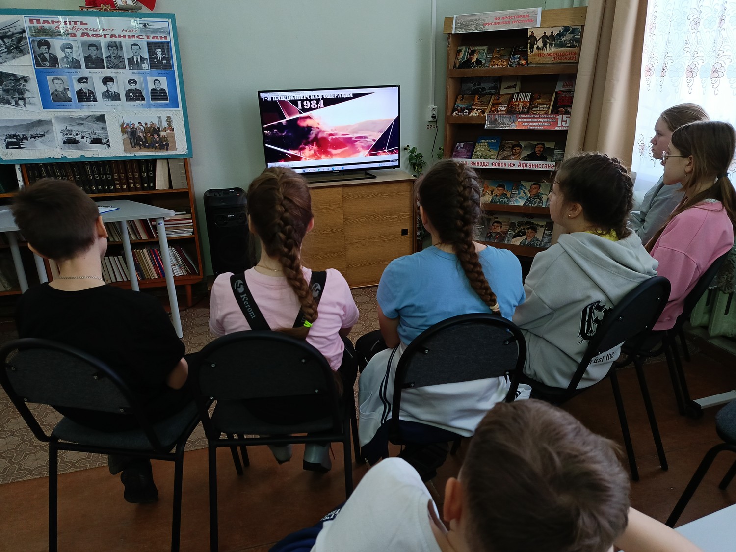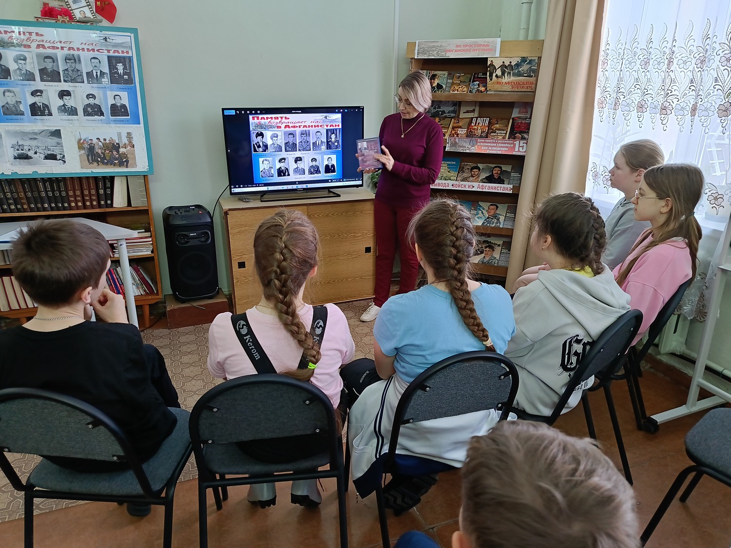 Рассказ сопровождался показом кадров документальной кинохроники «Афганская война: как это было», обзором книжной выставки «По Афганским дорогам».