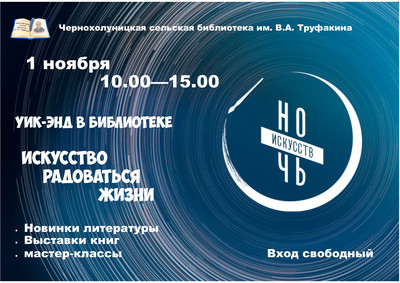 Библиотека предложит гостям и жителям поселка уик-энд «Искусство радоваться жизни». В его программу войдут мероприятия, приуроченные к Дню народного единства и Ночи искусств под девизом «Россия объединяет». Час национальной литературы «Истории с национальным колоритом» расскажет о творчестве современных авторов, представляющих различные народы России, арт-час «Вдыхая волшебство» предложит дорисовать рисунок в технике «ошибана» из сухих листьев. Традиционные народные промыслы будут представлены в медиа-панораме «Чудеса народного искусства». Приходите всей семьей провести время с пользой!